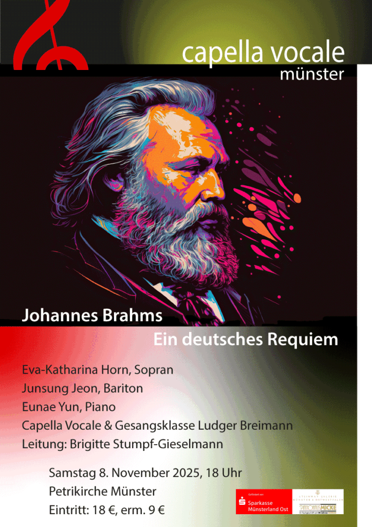 Die Capella Vocale probt derzeit das „Requiem“ von Johannes Brahms. Sie wird dabei unterstützt von SängerInnen der Gesangsklasse Ludger Breimann. Es gibt zwei Aufführungen:
